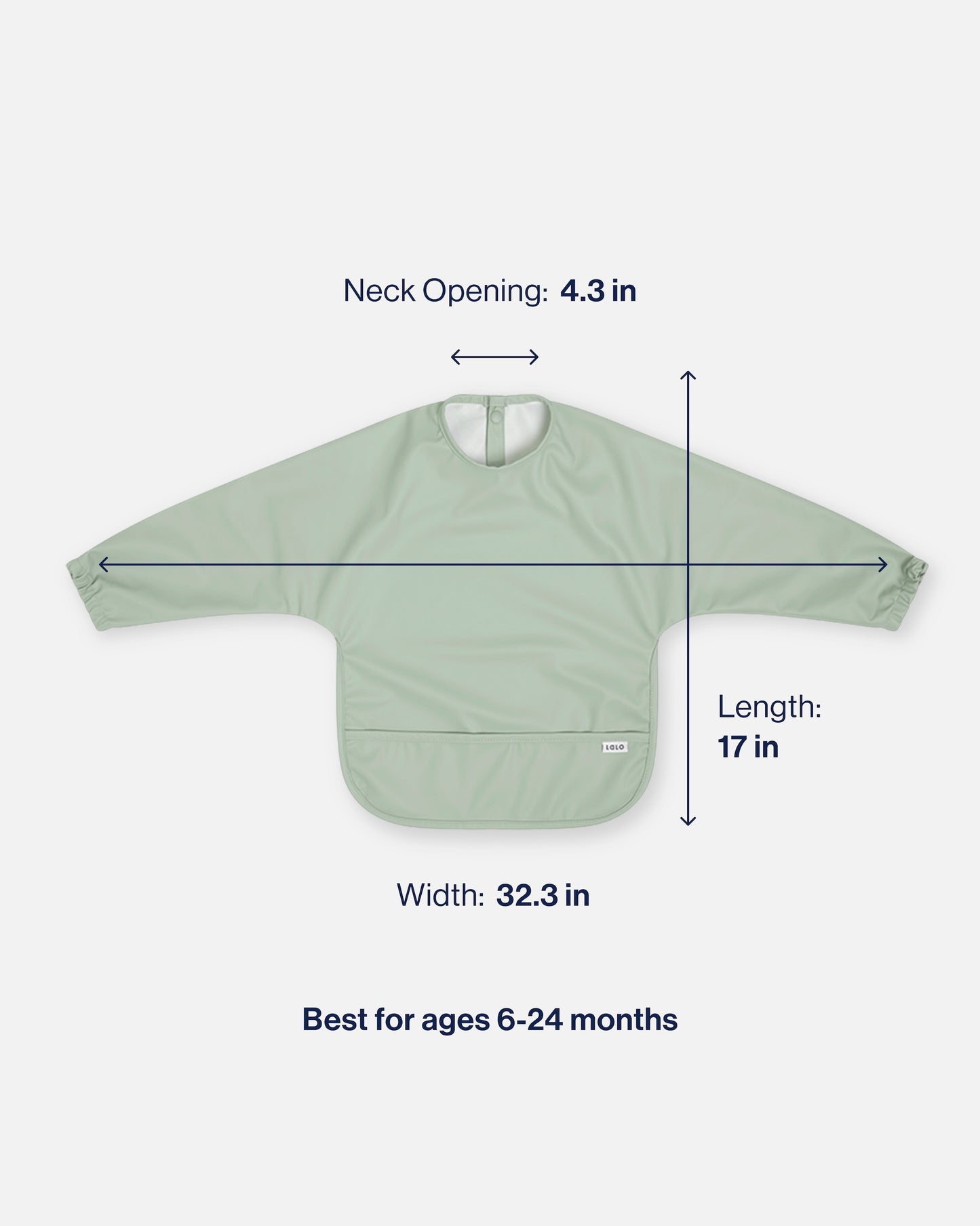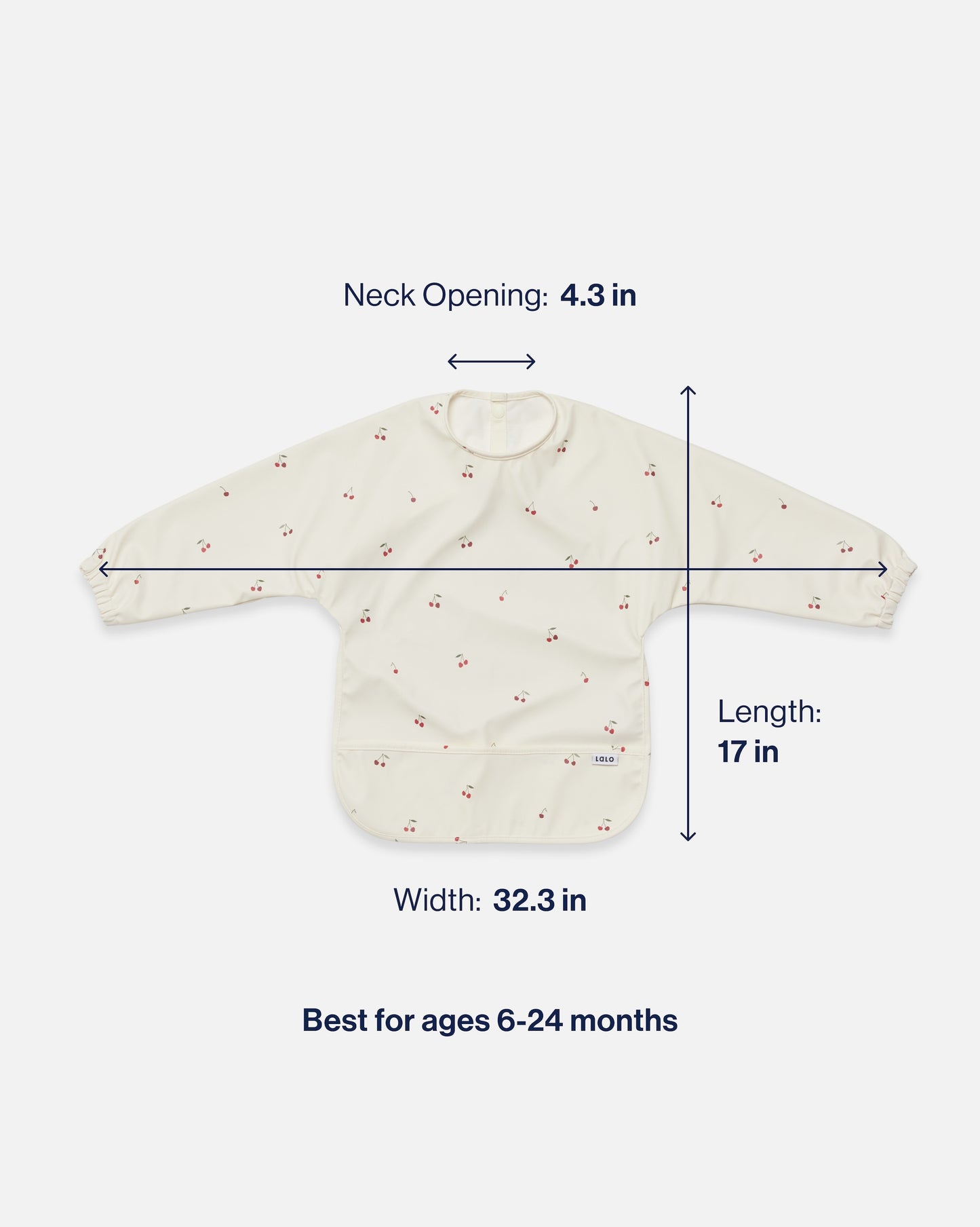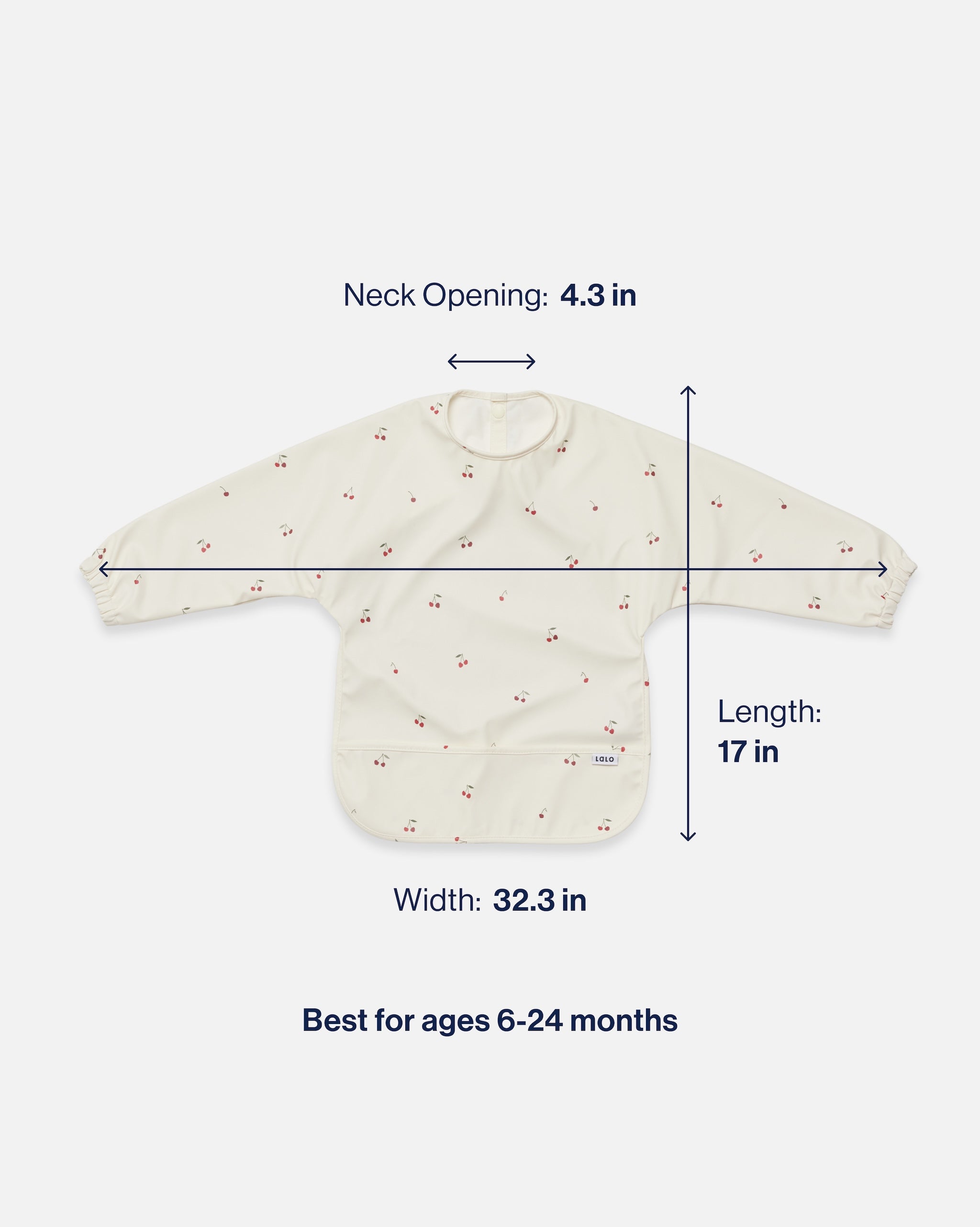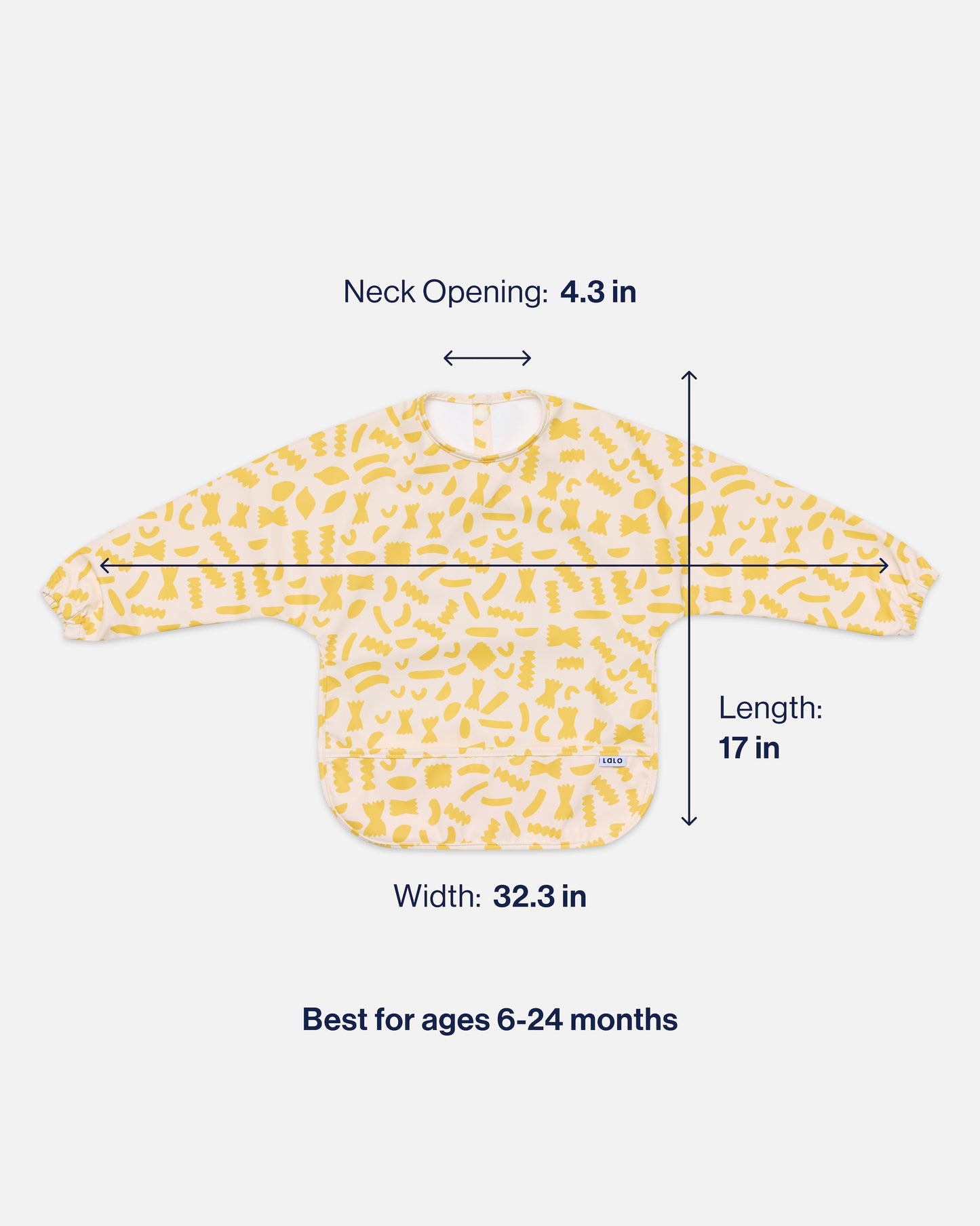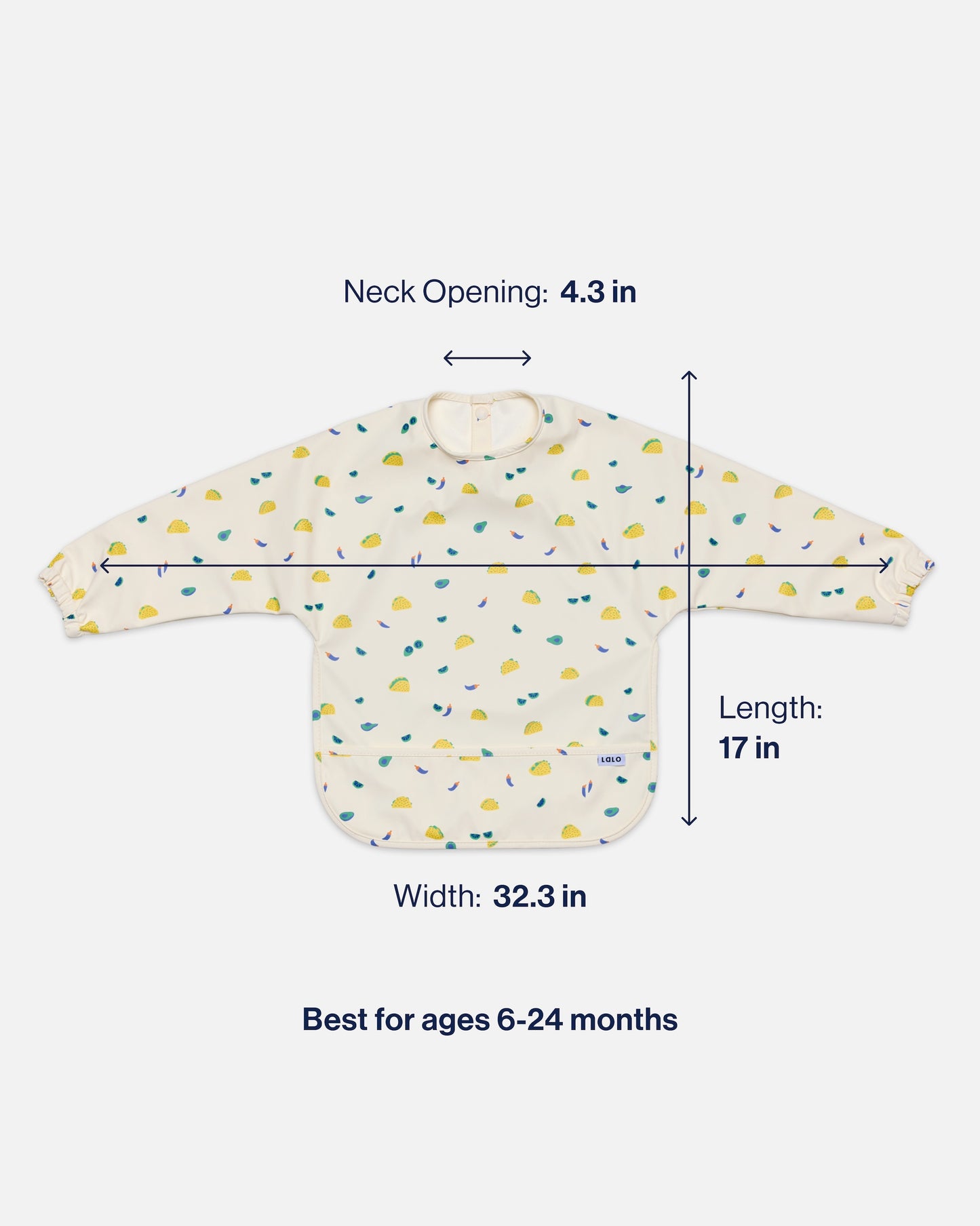 Dimensions: 6mo - 2yrs: 17" long x 32.3" wide, 4.3" neck opening;  2–4yrs: 19" long x 36" wide, 5" neck opening.