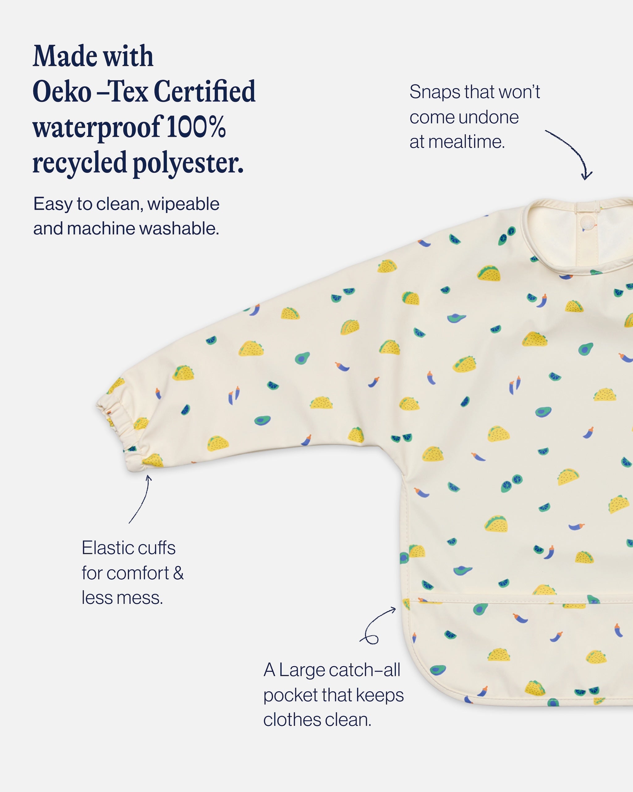 From mealtime to playtime, the Smock Bib covers it all. Made with 100% waterproof materials that wipe clean or machine wash like new, you won’t want to make a mess without it. The adjustable fit grows with your child and makes a great gift.
