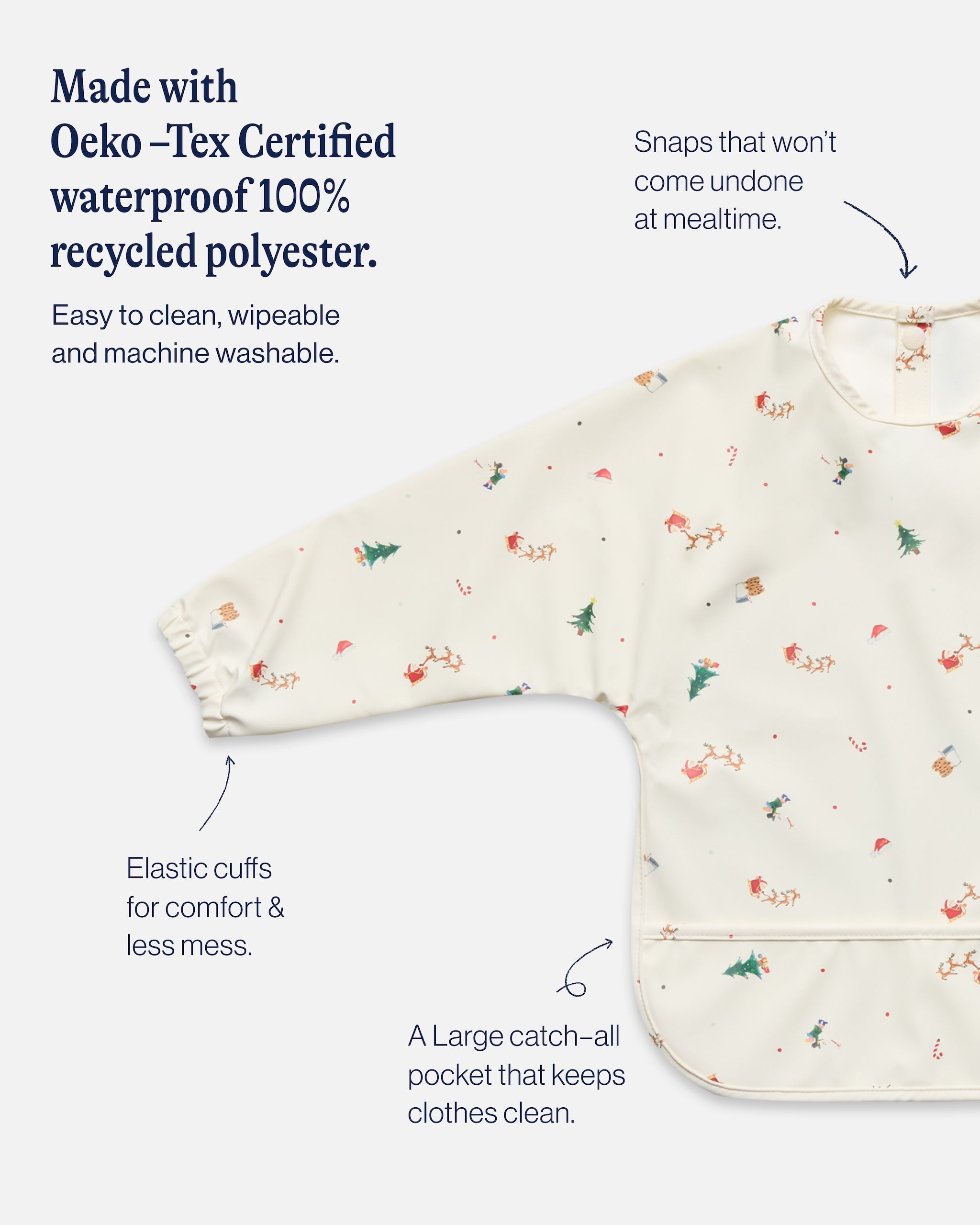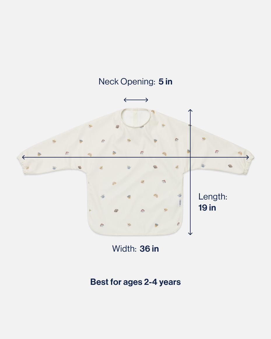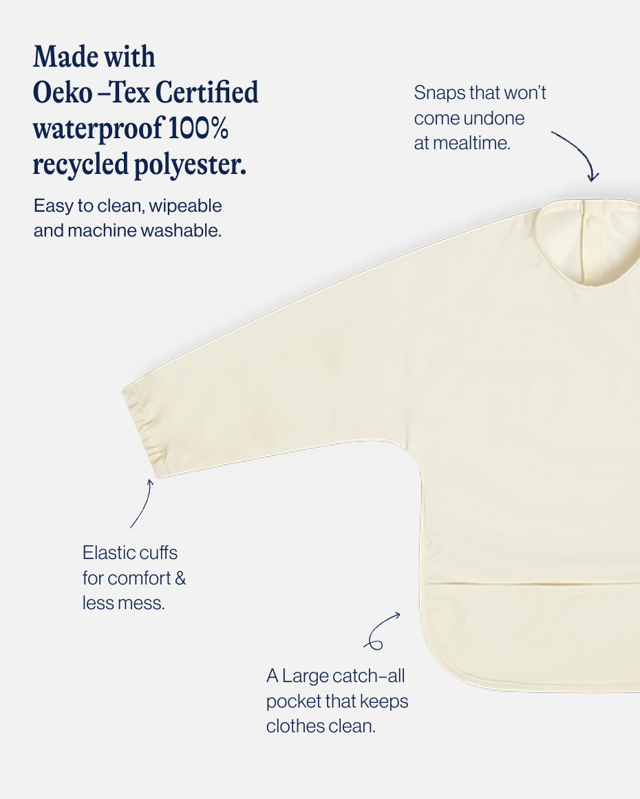From mealtime to playtime, the Smock Bib covers it all. Made with 100% waterproof materials that wipe clean or machine wash like new, you won’t want to make a mess without it. The adjustable fit grows with your child and makes a great gift.