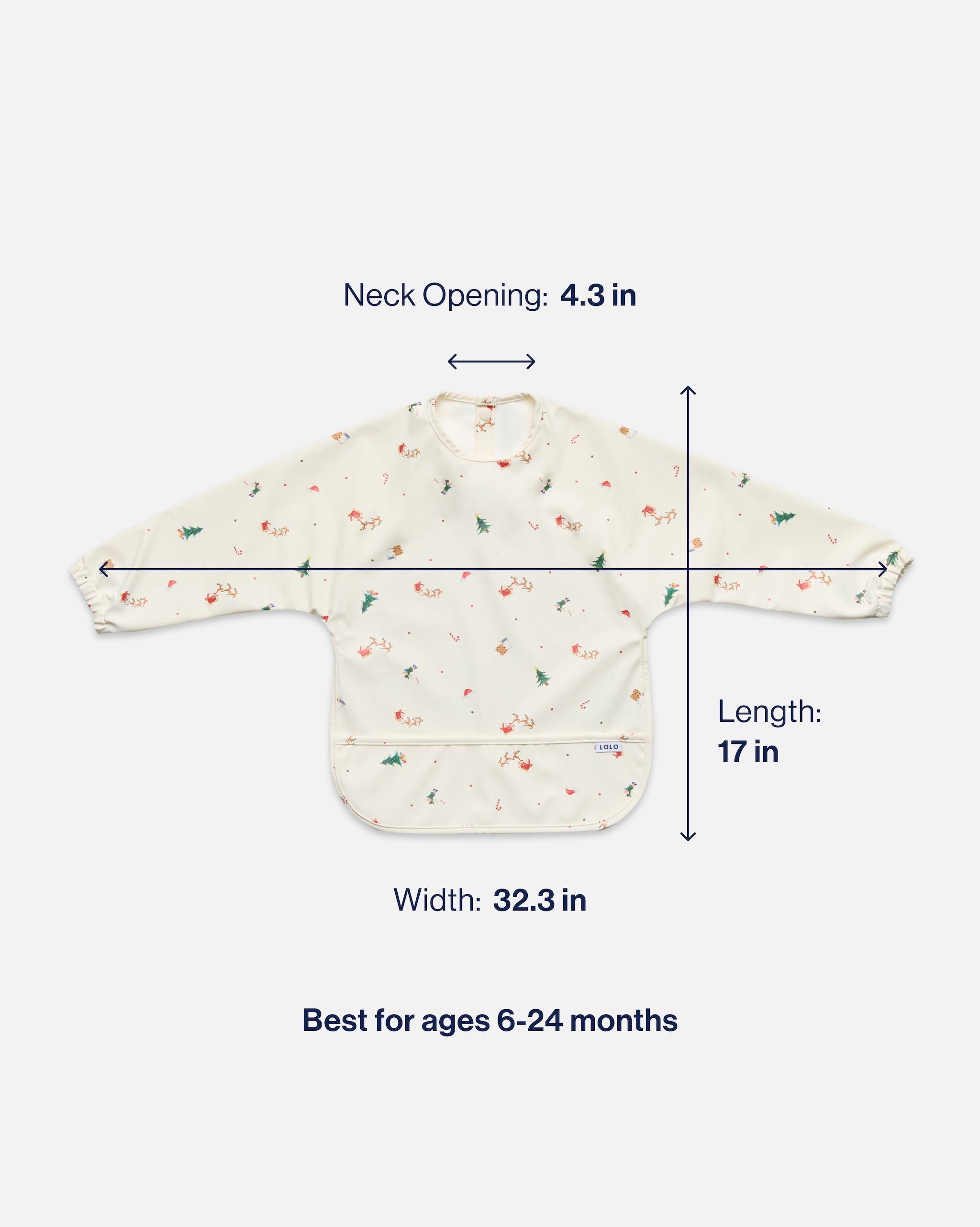 Dimensions: 6mo - 2yrs: 17" long x 32.3" wide, 4.3" neck opening; 2–4yrs: 19" long x 36" wide, 5" neck opening.