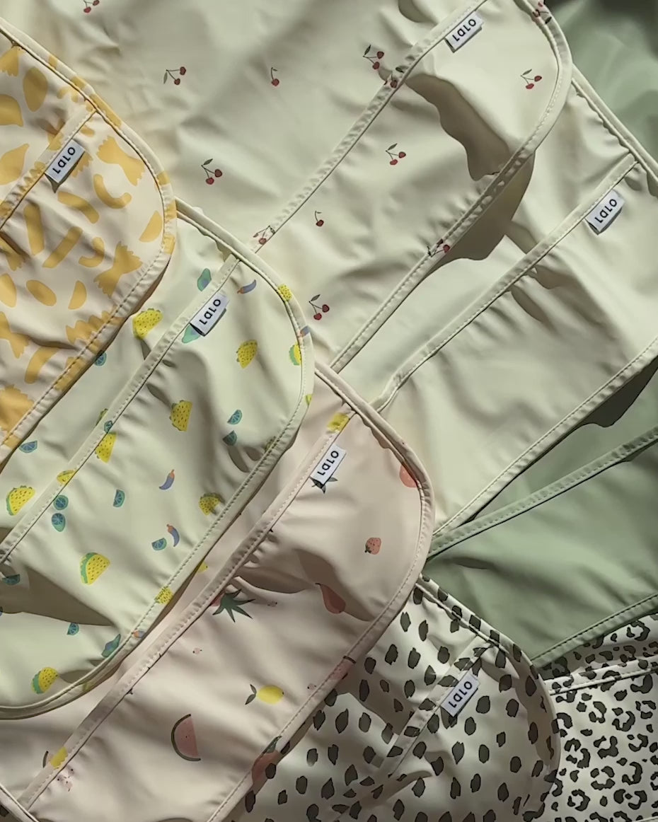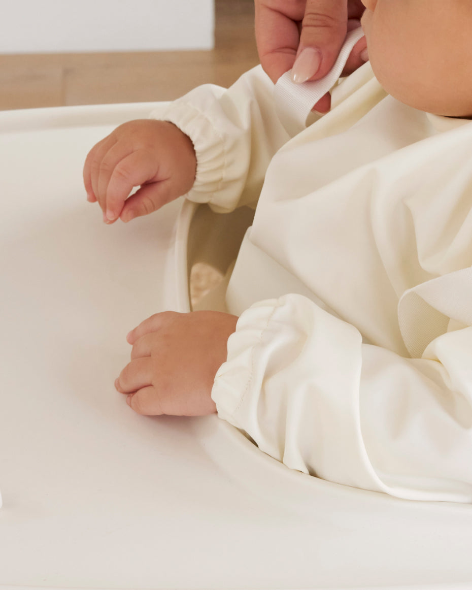 The Smock Bib is wipeable and machine washable! Simply wipe clean with a damp sponge and mild soap or machine wash on cold and air dry completely before storing. For best results, hang to dry, inside out after each use.