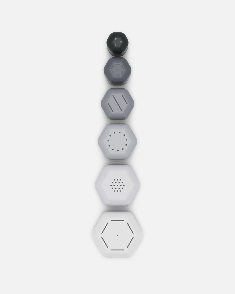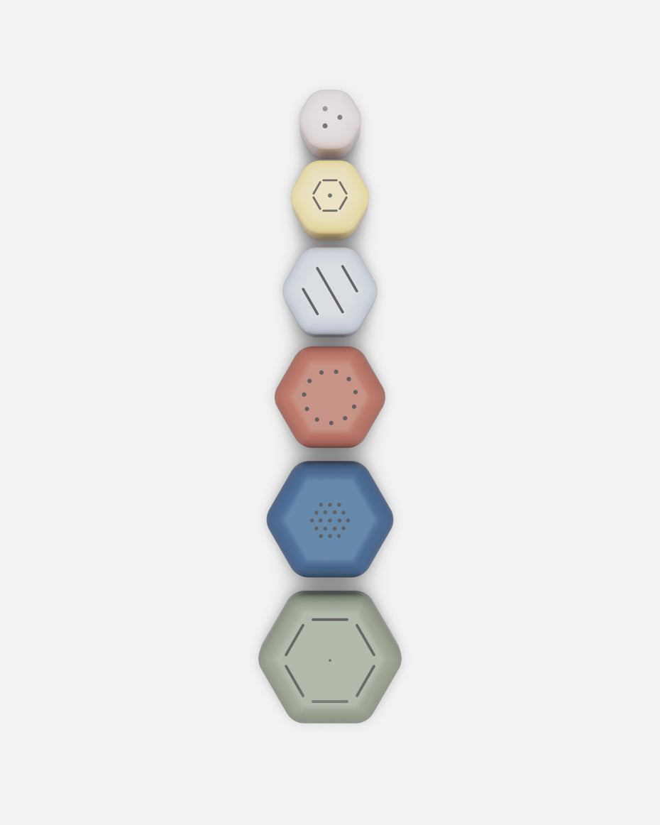 A set of 6 Stacking Cups promote open-ended play for splishing, splashing, and straining while they learn why water goes, well, everywhere. Make a tower or rinse off suds with fun dripping patterns.