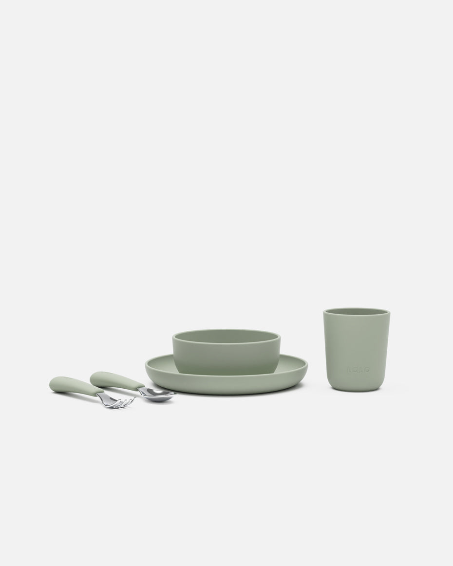 Materials: Bowl, Plate, Mealtime Cup: Non-toxic, BPA free, food grade silicone with a rigid core to give structure; Utensils: Non-toxic, BPA free, food grade silicone and stainless steel