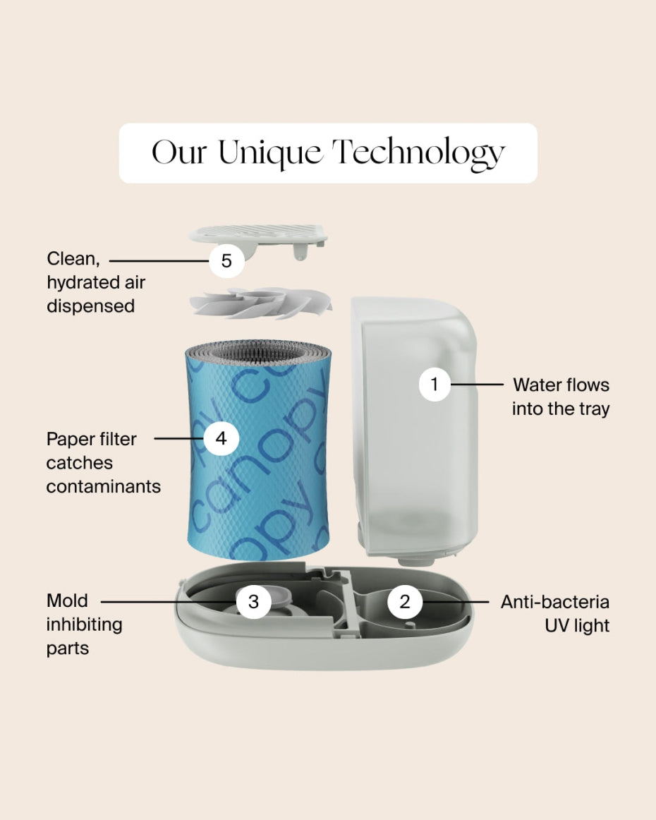 What's Included: Canopy Humidifier, Canopy Filter, Little Dreams Aroma Kit, USB-C power cord
