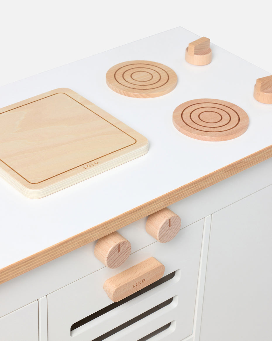 Coconut Play Kitchen includes a wooden cutting board, two plates, two teacups, and two saucers.