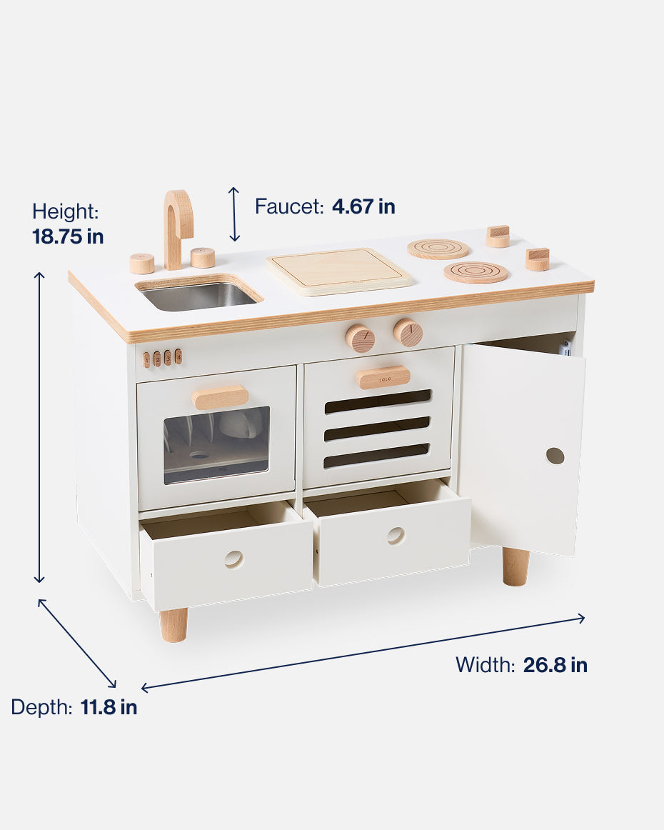 Dimensions: Play Kitchen: 26.8 x 11.8 x 23.42 in, counter height is 18.75 in; Play Fridge: 12.9 x 10.9 x 28.2 in; Shopping Cart: 16.7 x 13.1 x 21.9 in