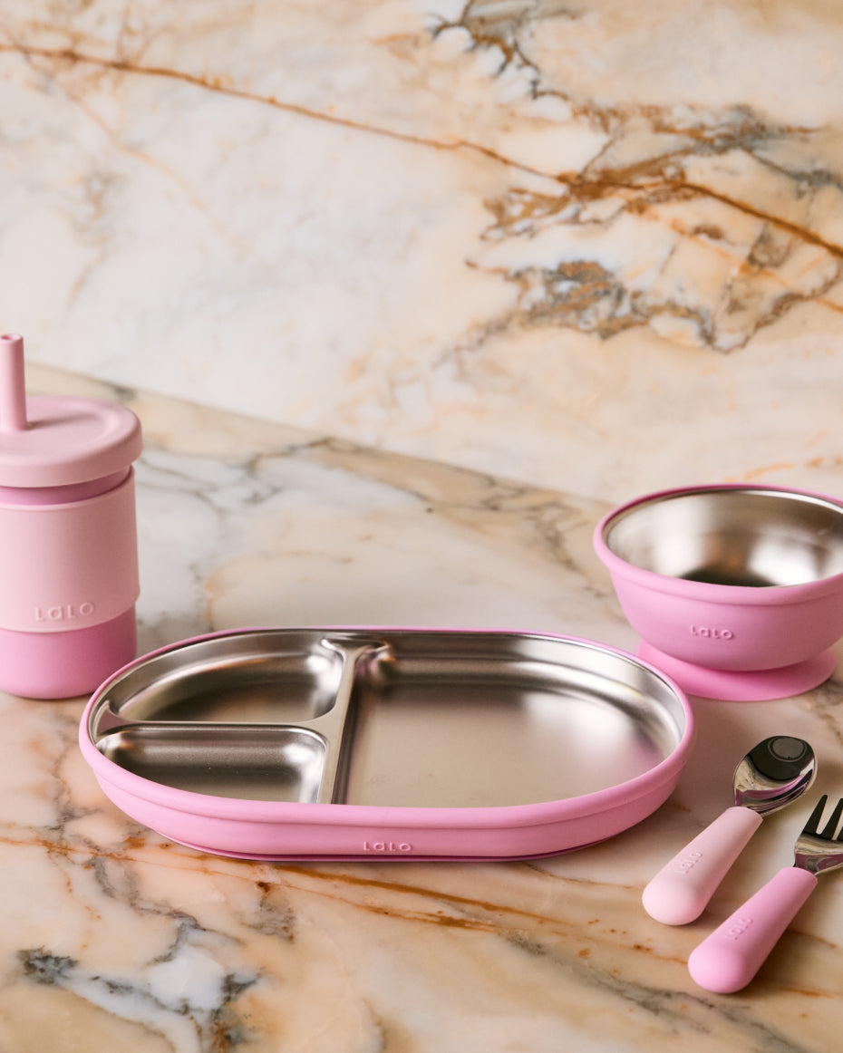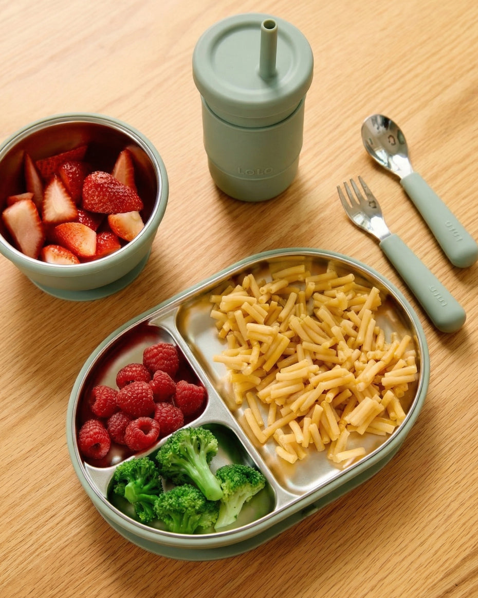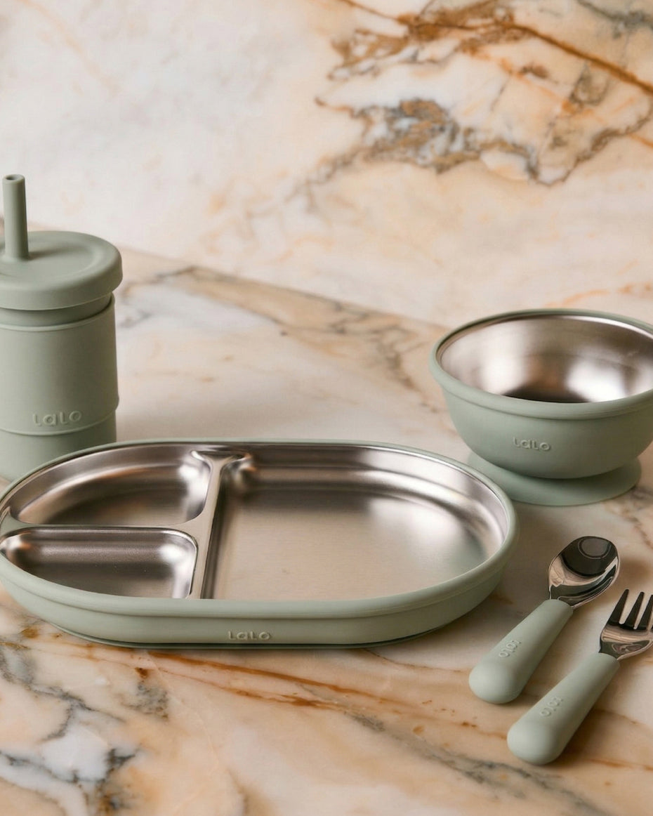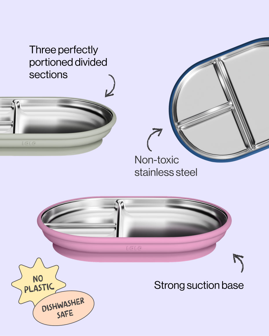 The ultimate stainless steel upgrade. 100% plastic-free and non-toxic suction plate, bowl, cup, and utensils. Even better, everything is dishwasher safe!