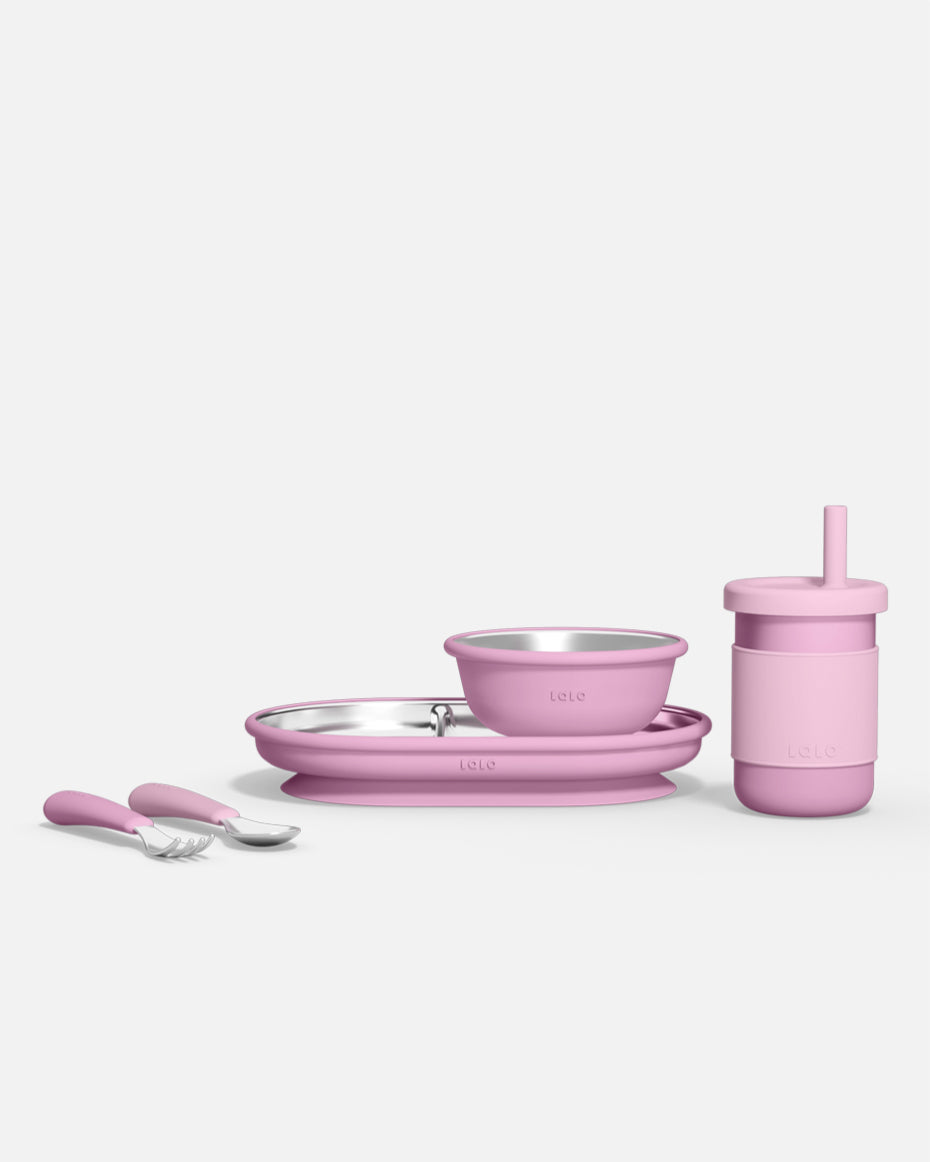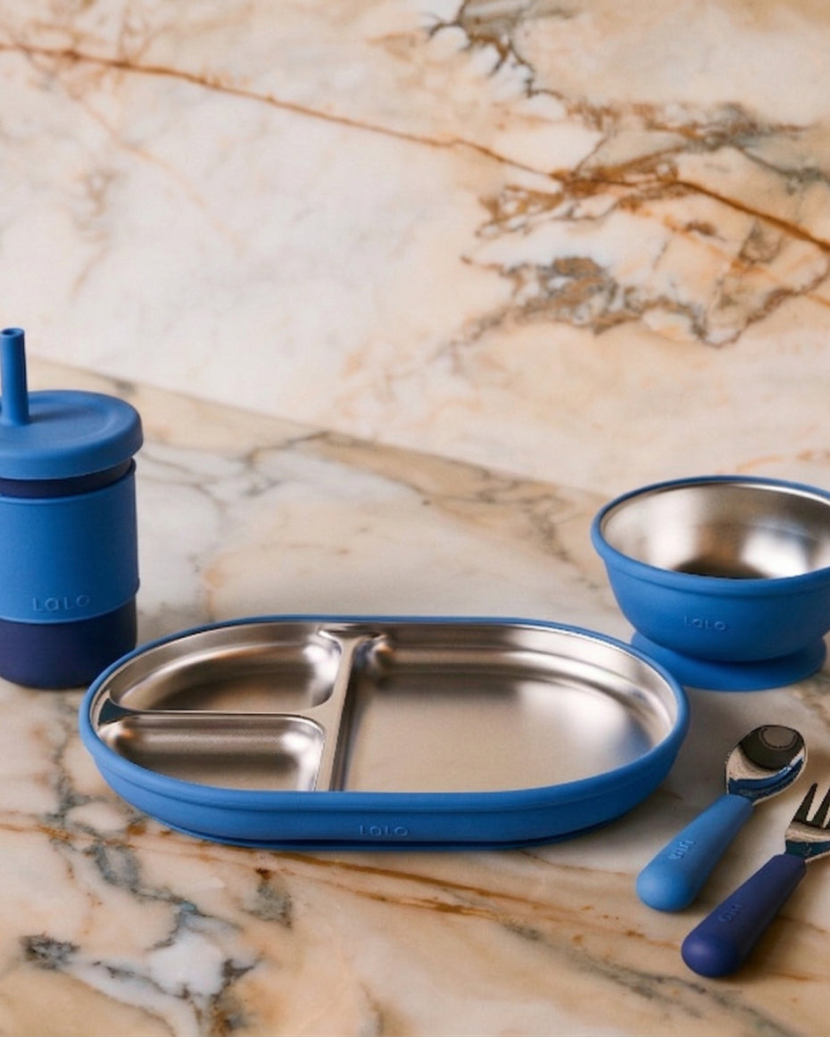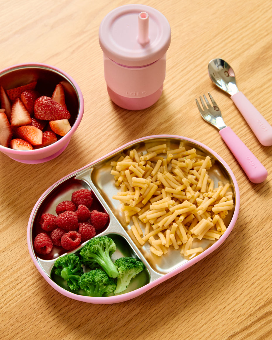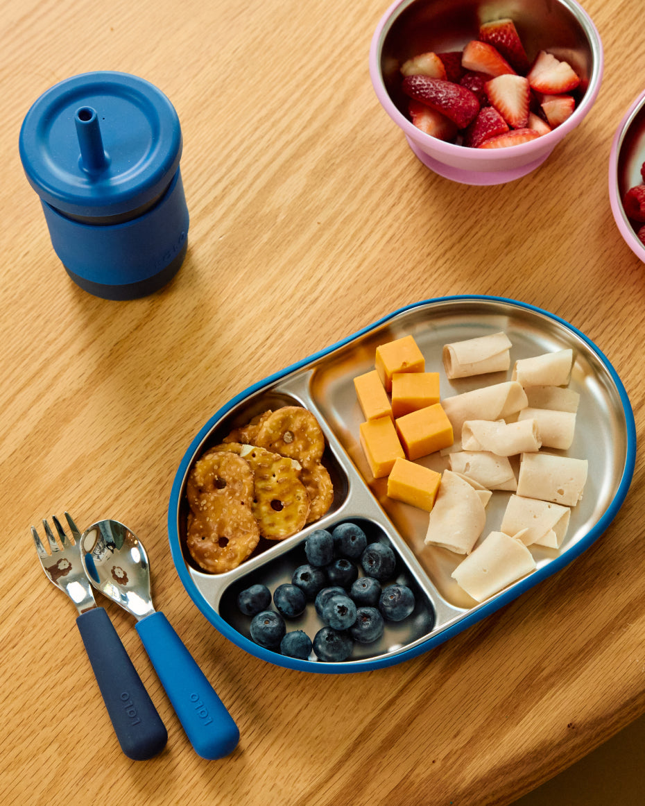 The ultimate stainless steel upgrade. 100% plastic-free and non-toxic suction plate, bowl, cup, and utensils. Even better, everything is dishwasher safe!