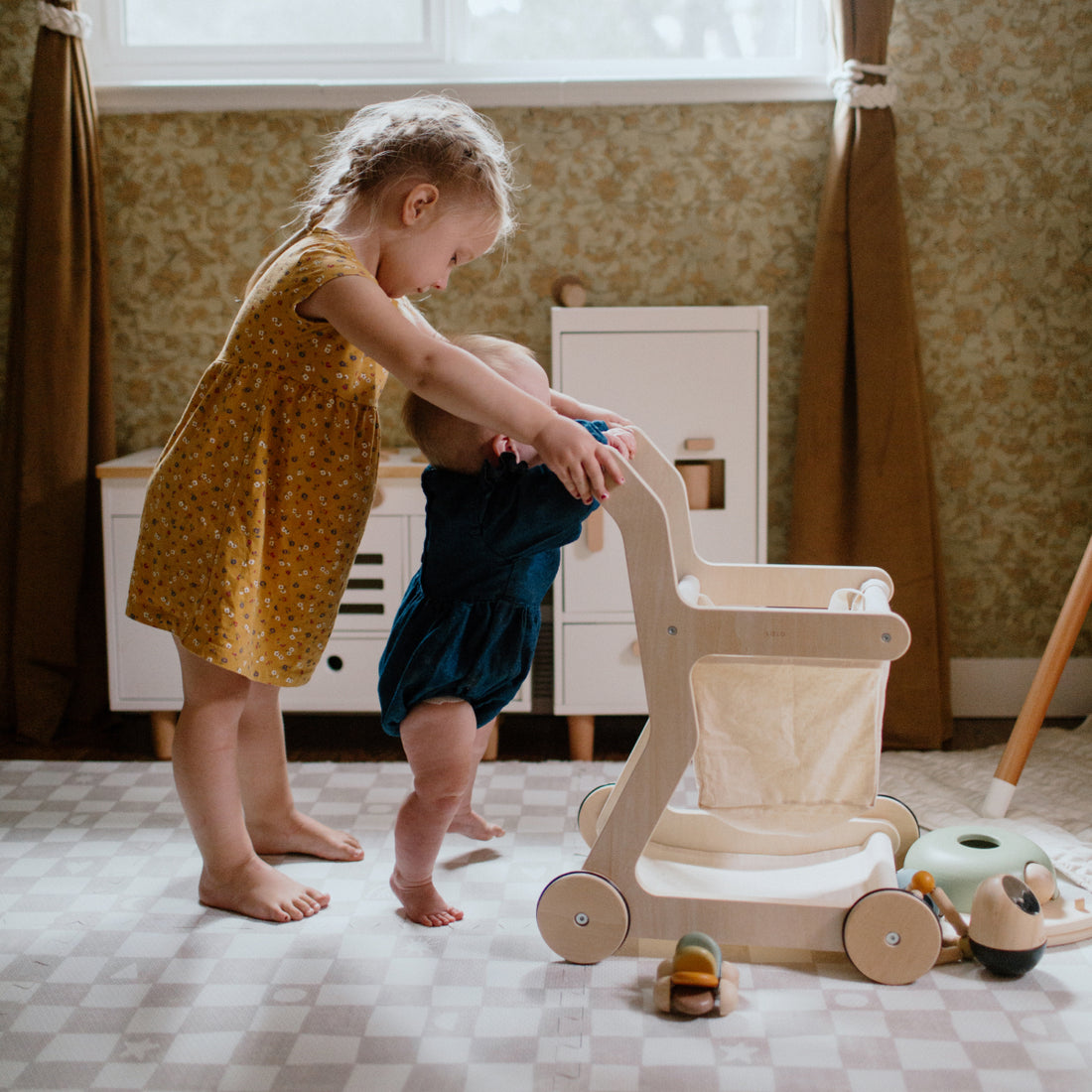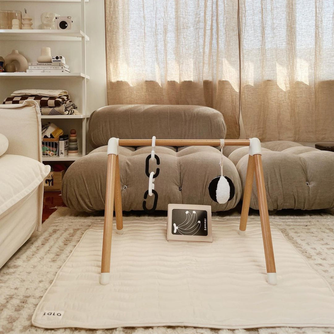 Materials: Legs + Base: Sustainably sourced FSC Certified beech wood; Seat + Belly Bar: Non-toxic plastic; Straps: Nylon
